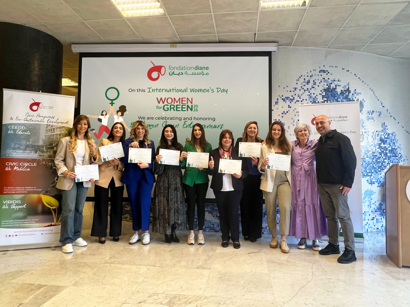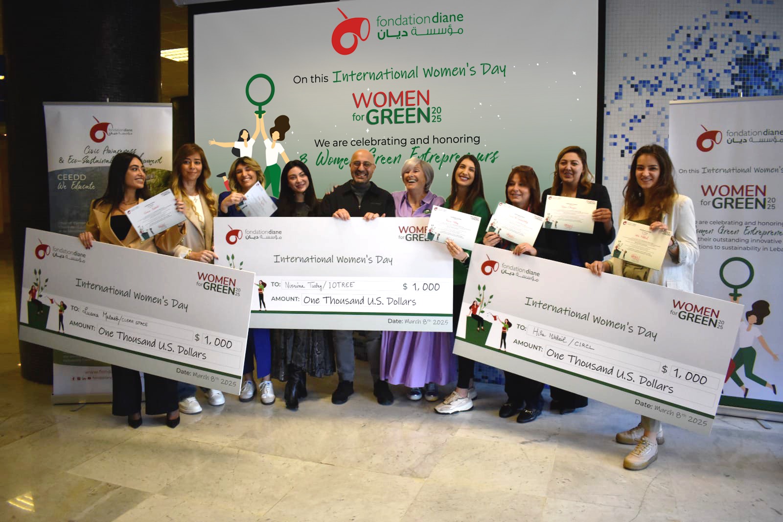 تحت شعار "معاً لدعم النساء اللواتي يحدثن فرقاً حقيقياً"، قامت مبادرة "نساء من أجل البيئة" Women For Green 2025 بتسليط الضوء على أبرز ٨ مشاريع وشركات ناشئة مستدامة تقودها نساء، تمّ اختيارهنّ بعناية من بين ٦٠ مرشّحة. حصلت جميع الفائزات على شهادات خضراء، بالإضافة إلى ورش استشارية مخصّصة وفرصة للظهور الإعلامي، بينما حصلت أول ٣ فائزات على جائزة نقدية قدرها ١٠٠٠ دولار أمريكي لكلّ منهنّ من مؤسسة ديان. وفي مفاجأة للحضور، أعلن روبير فاضل في نهاية الحفل عن تقديم جائزة مالية قدرها ١٠٠٠ دولار أمريكي لكل من الفائزات الخمس الأخريات!