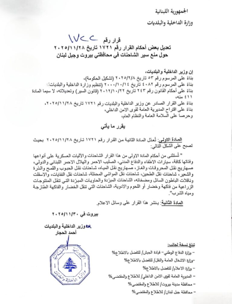 أصدرت وزارة الداخلية والبلديات تعديلًا طال بعض أحكام قرار منع سير الشاحنات في محافظتي بيروت وجبل لبنان خلال زيارة البابا لاوون الرابع عشر.