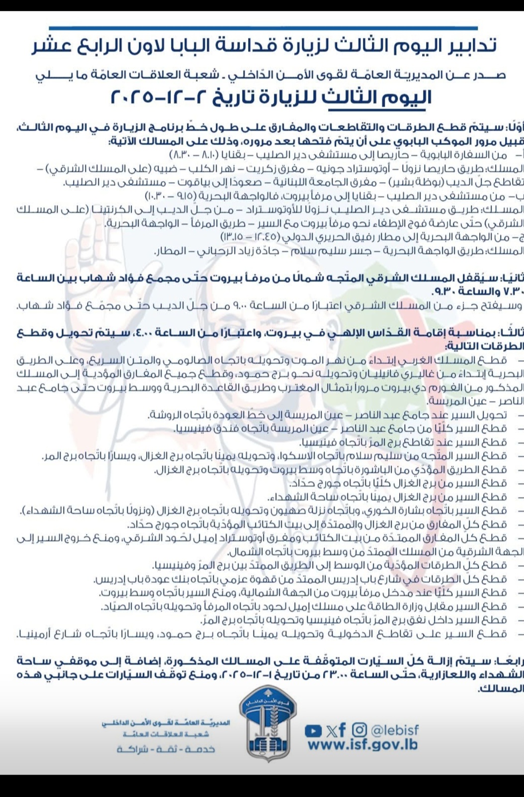 اعلنت المديرية العامة لقوى الأمن الداخلي في بيان تدابير سير لليوم الثاني والثالث لزيارة البابا لاوون الرابع عشر لبنان.