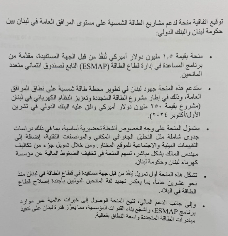 واعتبر انّ "المنحة التي قدمها البنك الدولي ستساعد وزارة الطاقة ومؤسسة كهرباء لبنان على التقدم في المخطط التي سينفذ من خلاله قرض الـ٢٥٠ مليون دولار، وجزء منه هو مشروع توليد الكهرباء من خلال محطة للطاقة الشمسية".